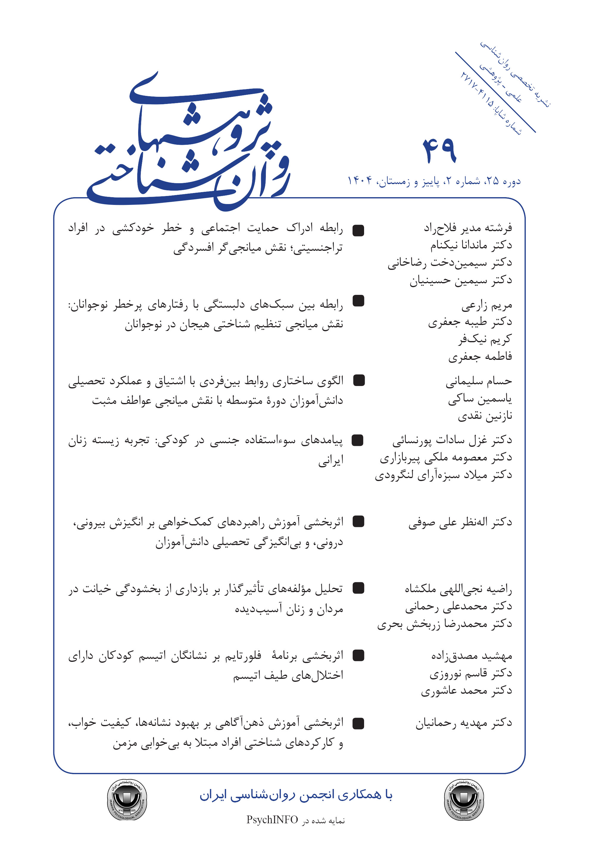 فهرست مقالات دسترسی آزاد مقاله صفحه چکیده متن کامل 1 - الگوی ساختاری روابط بینفردی با اشتیاق و عملکرد تحصیلی دانشآموزان دورۀ متوسطه با نقش میانجی عواطف مثبت حسام سلیمانی یاسمین ساکی نازنین نقدی دسترسی آزاد مقاله صفحه چکیده متن کامل 2 - رابطه ادراک حمایت اجتماعی و خطر خودکشی در افراد تراجنسیتی: نقش میانجیگر افسردگی ماندانا نیکنام فرشته مدیرفلاح راد سیمین دخت رضاخانی سیمین حسینیان دسترسی آزاد مقاله صفحه چکیده متن کامل 3 - رابطه بین سبکهای دلبستگی با رفتارهای پرخطر نوجوانان: نقش میانجی تنظیم شناختی هیجان در نوجوانان مریم زارعی فاطمه جعفری طیبه جعفری کریم نیک فر